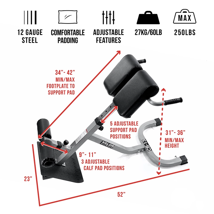 • Customizable Calf Support: Includes 3 calf pad positions with a 2-inch adjustment range, providing a secure anchor point for your legs during Roman Chair lifts and hyperextensions.