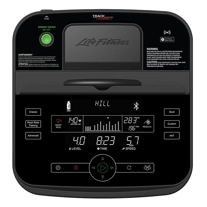 The Track Connect 2.0 console with enhanced Bluetooth allows you to bring all your workout data into one place with seamless integration with your favorite devices. This includes your Apple Watch or Samsung Galaxy Watch, as well as Apple or Android smartphones. You can sync with Apple Health or Fitbit by enabling proximity login on the Life Fitness Connect app. Alternatively, connect with other apps using FTMS. The upper Entertainment Zone with the integrated smartphone/tablet compression rack is at eye level for easy viewing as you follow along with your preferred fitness app or stream the latest episode of your favorite show, while the lower Workout Zone allows for easy setup and in-workout control.