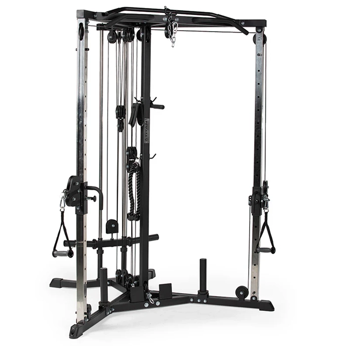 Achieve comprehensive full-body power from your home gym with this versatile Functional Trainer Plate Loaded. This machine is expertly designed to mimic real-life movements, effectively engaging multiple muscle groups simultaneously for a complete and highly effective strength training experience. It comes equipped with a multi-grip pull-up bar, a lat bar, dual stirrups, and a dedicated low row station, providing an extensive range of exercise options. The system’s fiberglass-reinforced pulleys deliver fluid, smooth pulls for a full range of motion, and its dual cable ratios allow you to customize your workouts for both pure strength and endurance. The 1:1 ratio maximizes the weight load to build strength during resistance-focused exercises, while the 1:2 ratio offers a lighter feel for more controlled movements, which is perfect for reducing joint strain during high-rep exercises.