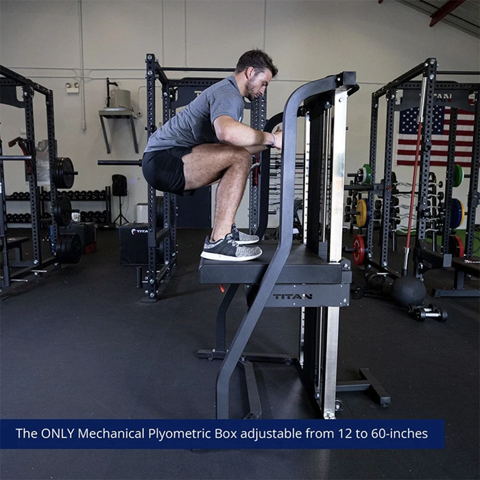 Unleash your inner Titan with the Lower Body 60 inch Ronin Plyometric Machine, a revolutionary all-in-one plyo box that eliminates the need for multiple boxes. Constructed from durable steel, it features an adjustable platform that raises and lowers from 12 to 60 inches in one-inch increments, with a weight-stack counterweight system for smooth adjustments. With a user weight capacity of 400 lbs, a slip-free firm foam landing surface, and welded-on wheels for quick mobility, the Ronin Plyometric Machine is built to improve muscle tension, agility, and explosive power for any training routine.
