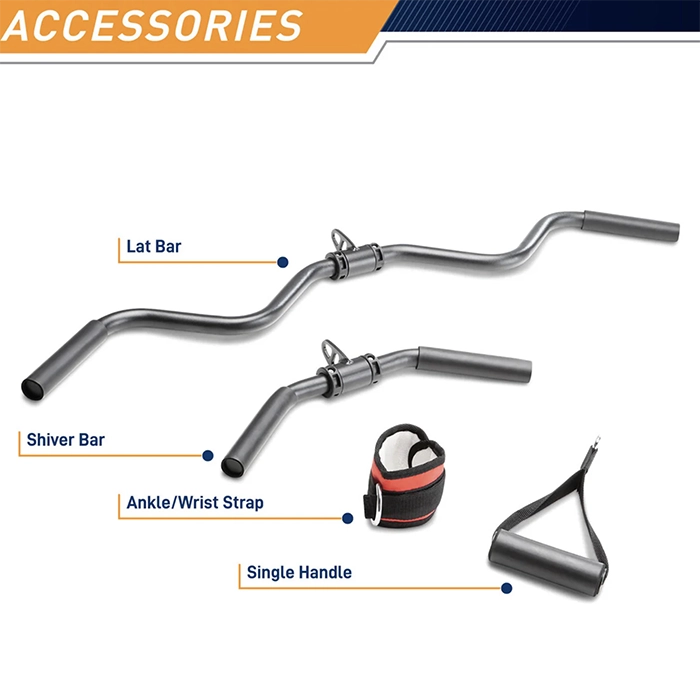 • Upper and Lower Pulley System: Utilize the high pulley and included Lat Bar for pulldowns to build back strength, or engage the lower pulley and footplate for seated rows, bicep curls, and upright rows.