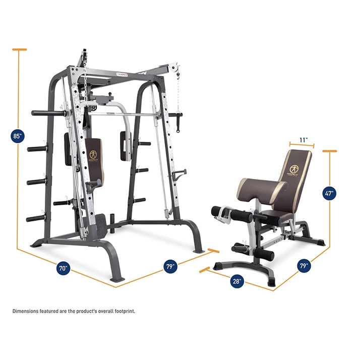 The Marcy Smith Machine Cage System MD-9010G is a comprehensive, all-in-one strength training station for your home. Combining an Olympic Smith bar with ultra-glide linear bearings, a functional cable crossover system, and a versatile adjustable bench, this heavy-duty cage replaces multiple pieces of equipment to provide a professional-grade, full-body workout.