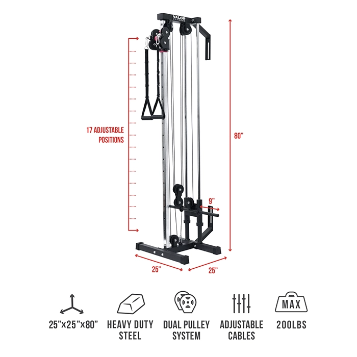 The Valor Fitness Wall Mounted Cable Station is a space-efficient powerhouse designed to bring professional functional training to home gyms and studios. Featuring a 16-position dual-pulley system and a heavy-duty steel frame, this plate-loaded tower supports both Standard and Olympic plates, offering a smooth and versatile workout experience in a compact 80-inch vertical design.